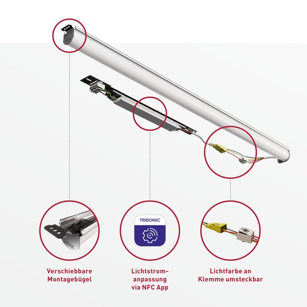 8.0-15.4 W LED, 980-1890 Lumen, 123 Lumen/Watt, 3000/4000 Kelvin. L=574mm, CRI>90, IP20. Energieeffizienzklasse der Lichtquelle: D. Montagedistanz 587-657 mm. Mit 4 Magneten als Montagehilfe, Konverter- und Leuchteneinheit durch Stecker trennbar. Lichtfarbe wählbar 3000/4000 K, Lichtstärke in definiertem Bereich einstellbar mit Tridonic-App 4service NFC. Mit elektronischem Betriebsgerät.