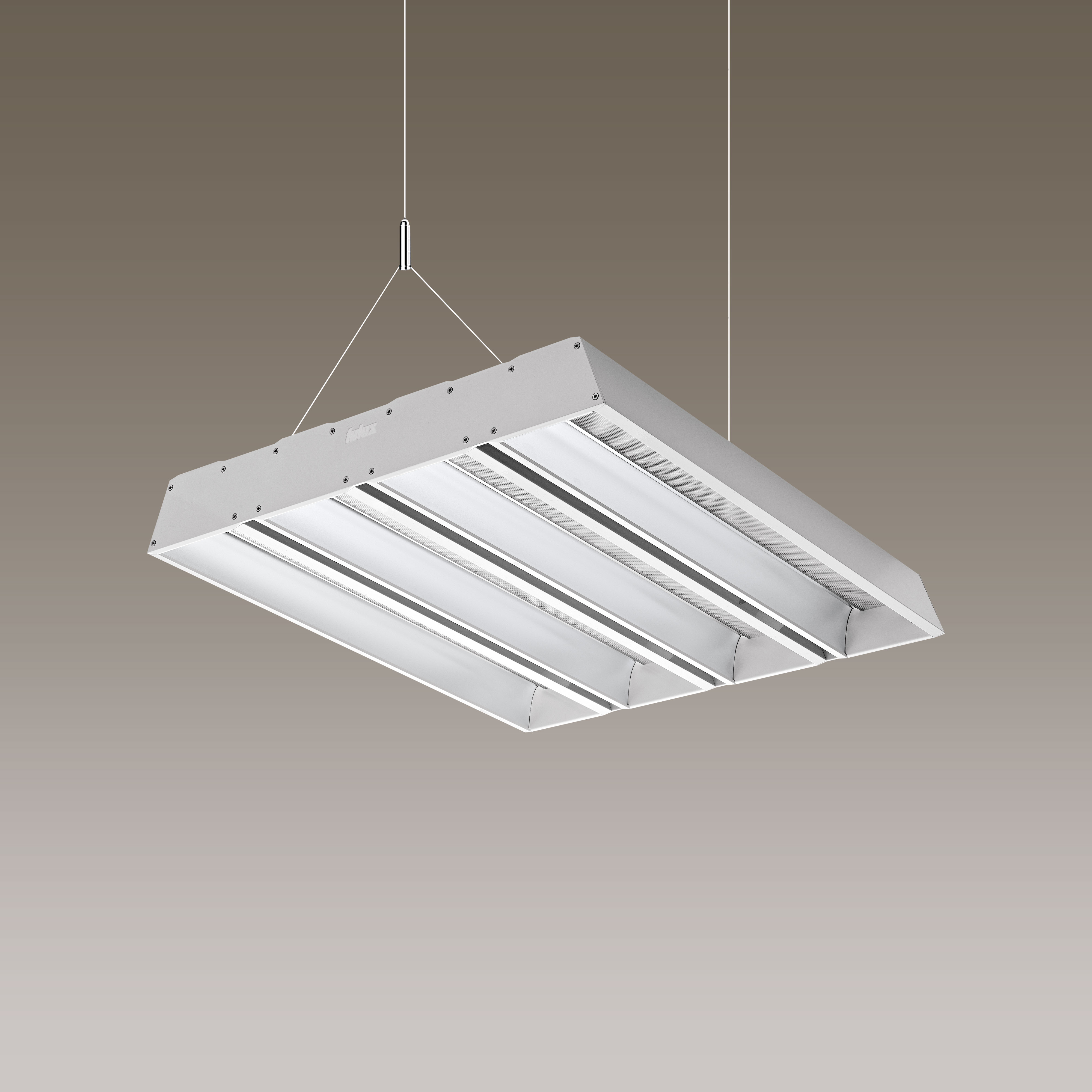 Boîtier, structure fine, blanc mat. Réflecteur en aluminium pur, éloxé brillant mat, de haute réflexion. Ecran en verre prismatique polycarbonate. Suspension à câbles en acier réglable en hauteur. Compartiment LED IP50. Avec appareillage électronique. CRI >80.