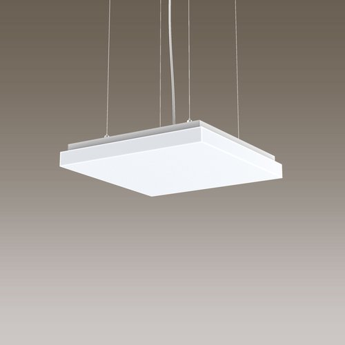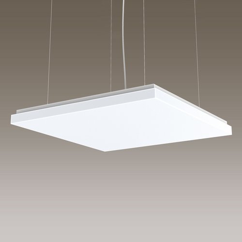 41W LED, 5879 Lumen, 144 Lumen/Watt, 4000 Kelvin. L=650mm, l=650mm, A=59mm, CRI>90, UGR<22, IP40. Compartiment LED IP50. Classe d'efficacité énergétique de la source lumineuse: C. Pour montage au plafond. Écran opale en verre acrylique. Flux lumineux bas. Avec appareillage électronique et alimentation de secours intégrée. Avec commande DALI. Suspension à câbles en acier 1 m, réglable en hauteur. 1.15 m de câble de raccordement blanc inclus.