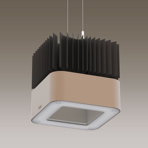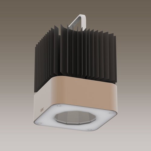 116.8W LED, 16299 Lumen, 140 Lumen/Watt, 3000 Kelvin. H=2290mm, h=290mm, Q=300x300mm, CRI>80, UGR<22, IP65. Leuchte aus Aluminium. Kühlkörper moorgrau. Reflektor aus interferenzarmem Reinstaluminium mattglanz eloxiert. Gehäuse chamois-metallisé. Stahlseilaufhängung, höhenverstellbar. Lichtverteilung rotationssymmetrisch. Breitstrahlend. Für Umgebungstemperaturen von -25°C bis +45°C geeignet. Höhere Temperaturbeständigkeiten auf Anfrage. Mit Sicherheitsglas klar und Dichtung. Mit elektronischem Betriebsgerät.