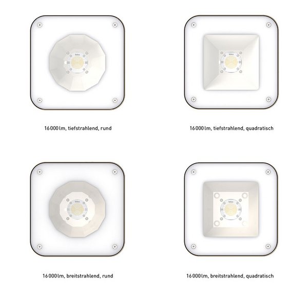 - Die symmetrische Lichtverteilung ist quadratisch oder rund erhältlich