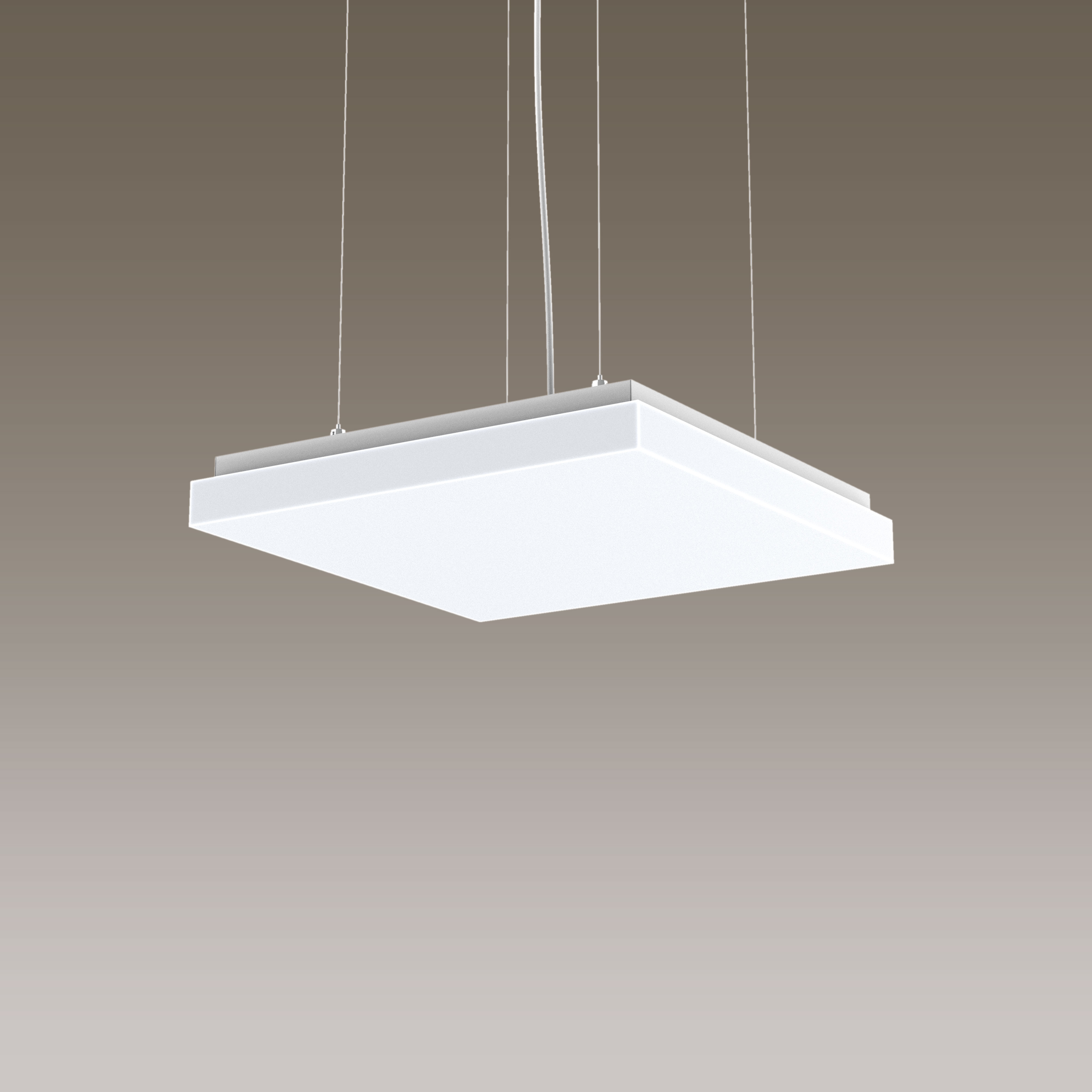 IP40. Für Pendelmontage. 420 x 420 mm. Blende aus Acrylglas opal. Lichtleistung mittel oder tief.