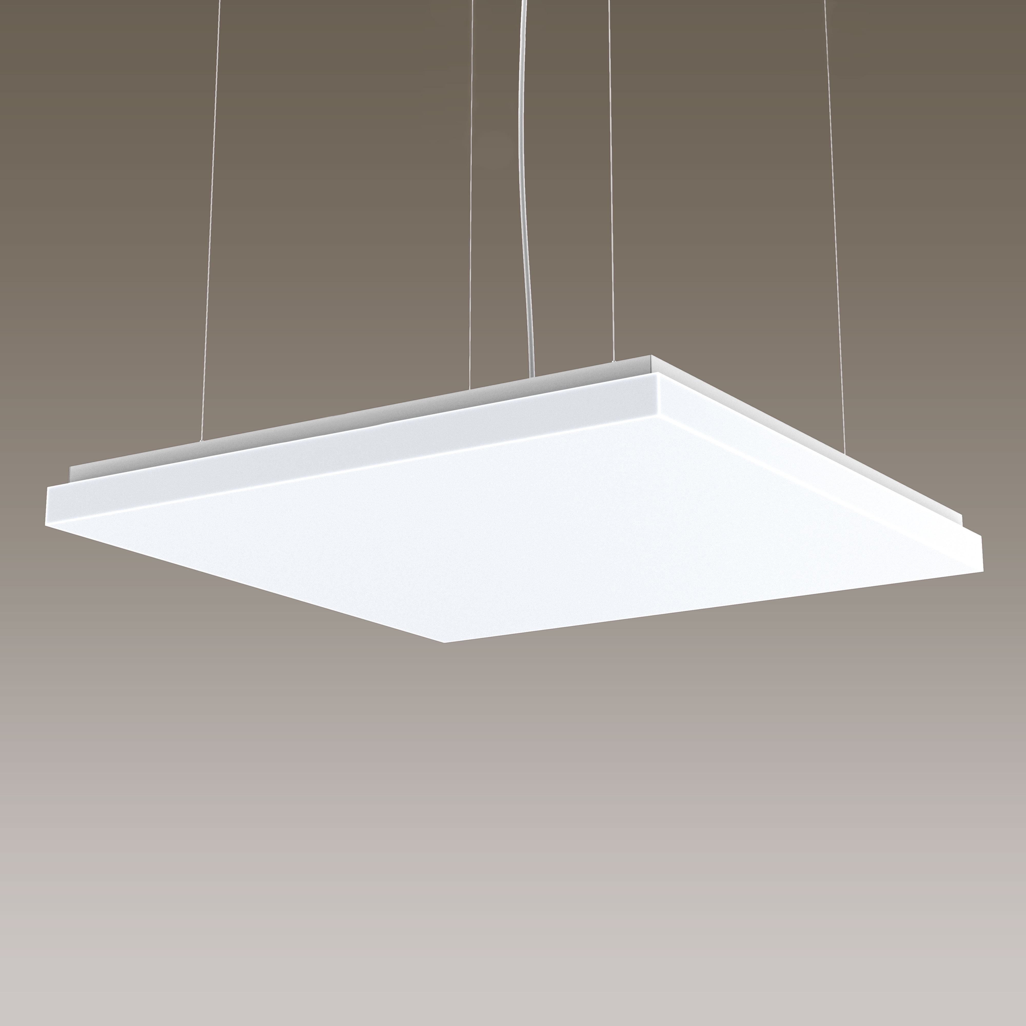 IP40. Für Pendelmontage. 650 x 650 mm. Blende aus Acrylglas opal. Lichtleistung mittel oder tief.