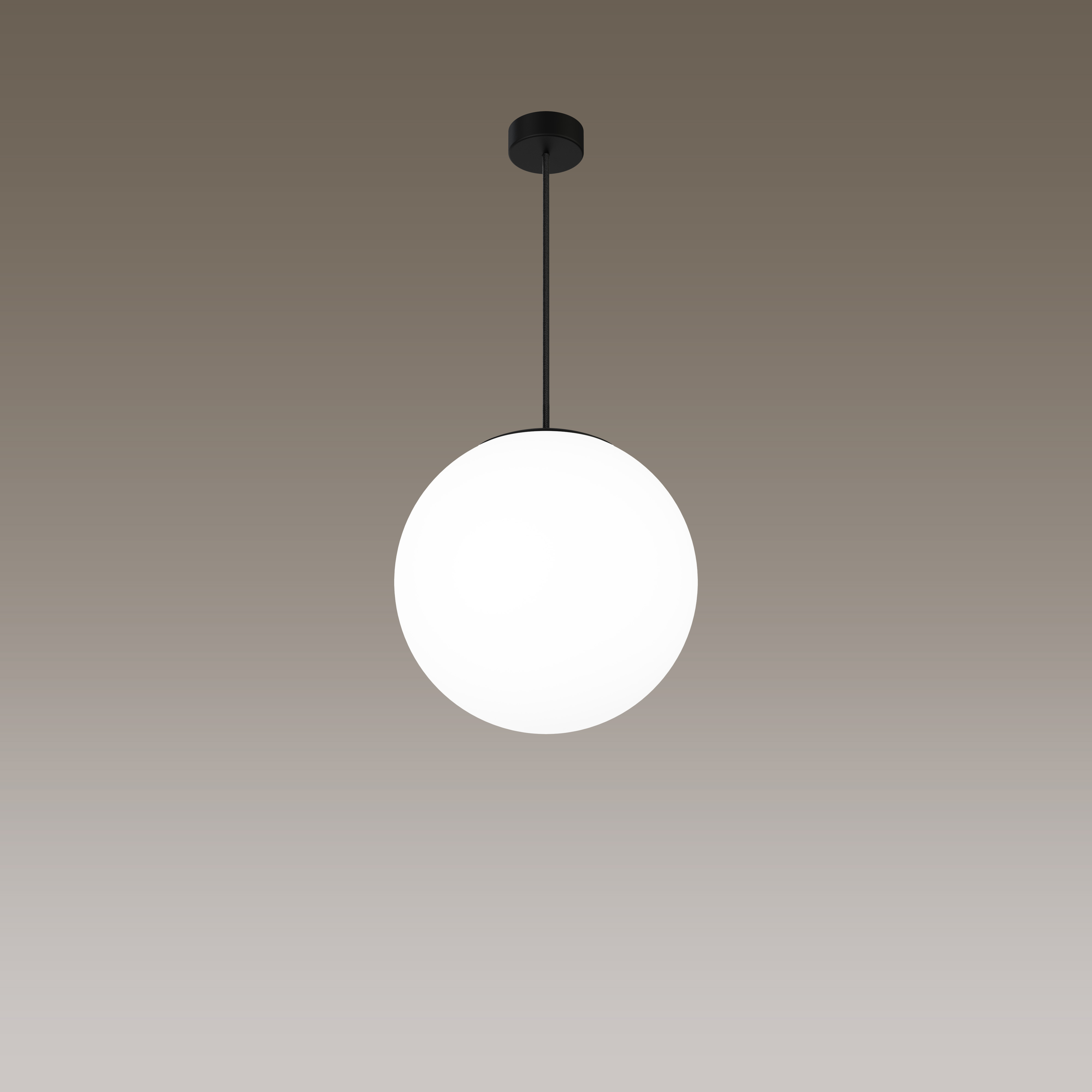 Ø 300 mm, IP20. Für Deckenmontage. Kugelblende aus Glas oder Kunststoff opal matt. Gehäuse, Baldachin und Pendelleitung (Textilkabel) schwarz matt. Lichtleistung tief (*-T*) oder mittel (*-M*).