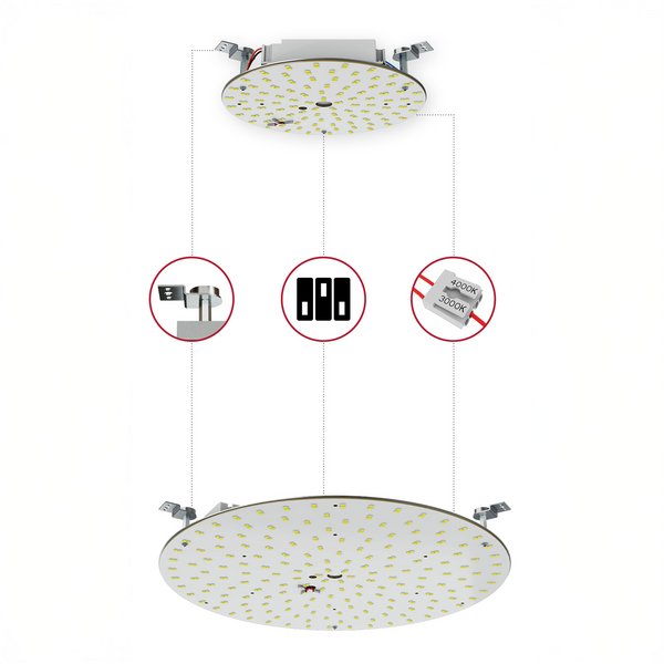 14.3-40.6 W LED, 2165-5725 Lumen, 141 Lumen/Watt, 3000/4000 Kelvin. H=36mm, Ø=342mm, CRI>90. Energieeffizienzklasse der Lichtquelle: D. Lichtfarbe wählbar 3000/4000 K, Lichtstärke in definiertem Bereich einstellbar via DIP-Schalter. Mit 4 Magneten als Montagehilfe. Montagebügel zur Deckenbefestigung variabel positionier- und schwenkbar. Status-LED flexibel positionierbar. Mit elektronischem Betriebsgerät und integrierter Notstromversorgung. Mit DALI-Steuerung.
